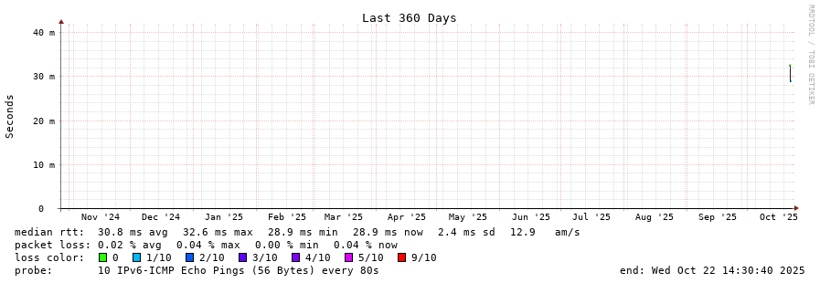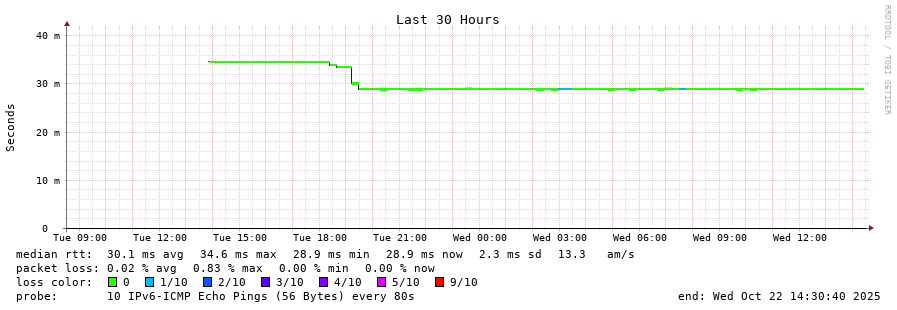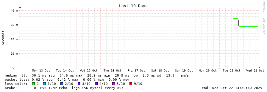 traceroute to 2a00:c30:bbbb:d::2 (2a00:c30:bbbb:d::2), 30 hops max, 80 byte packets - Generated at 2025-10-22 01:00:01